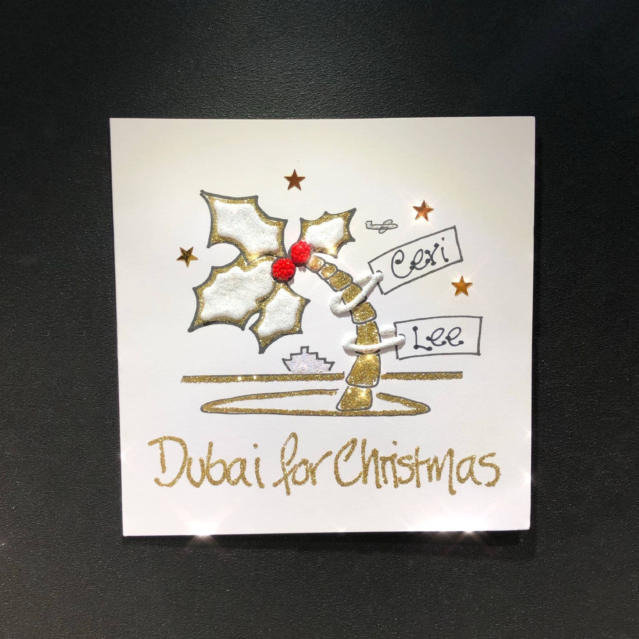 This card is designed for names to be placed in the tags and your own personal message to be placed beneath the palm tree as shown.