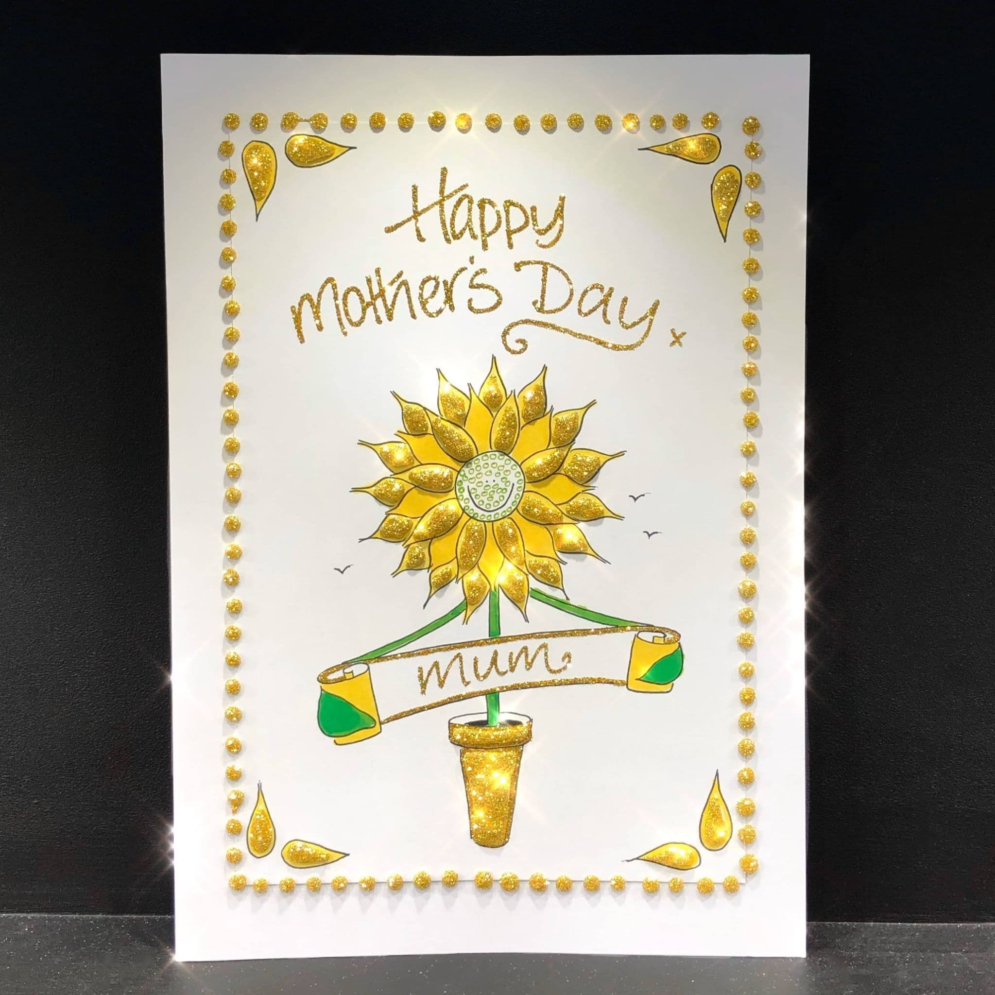 This card is designed for your message to be placed above the sunflower and "mum", "mummy" etc to be placed in the banner as shown.