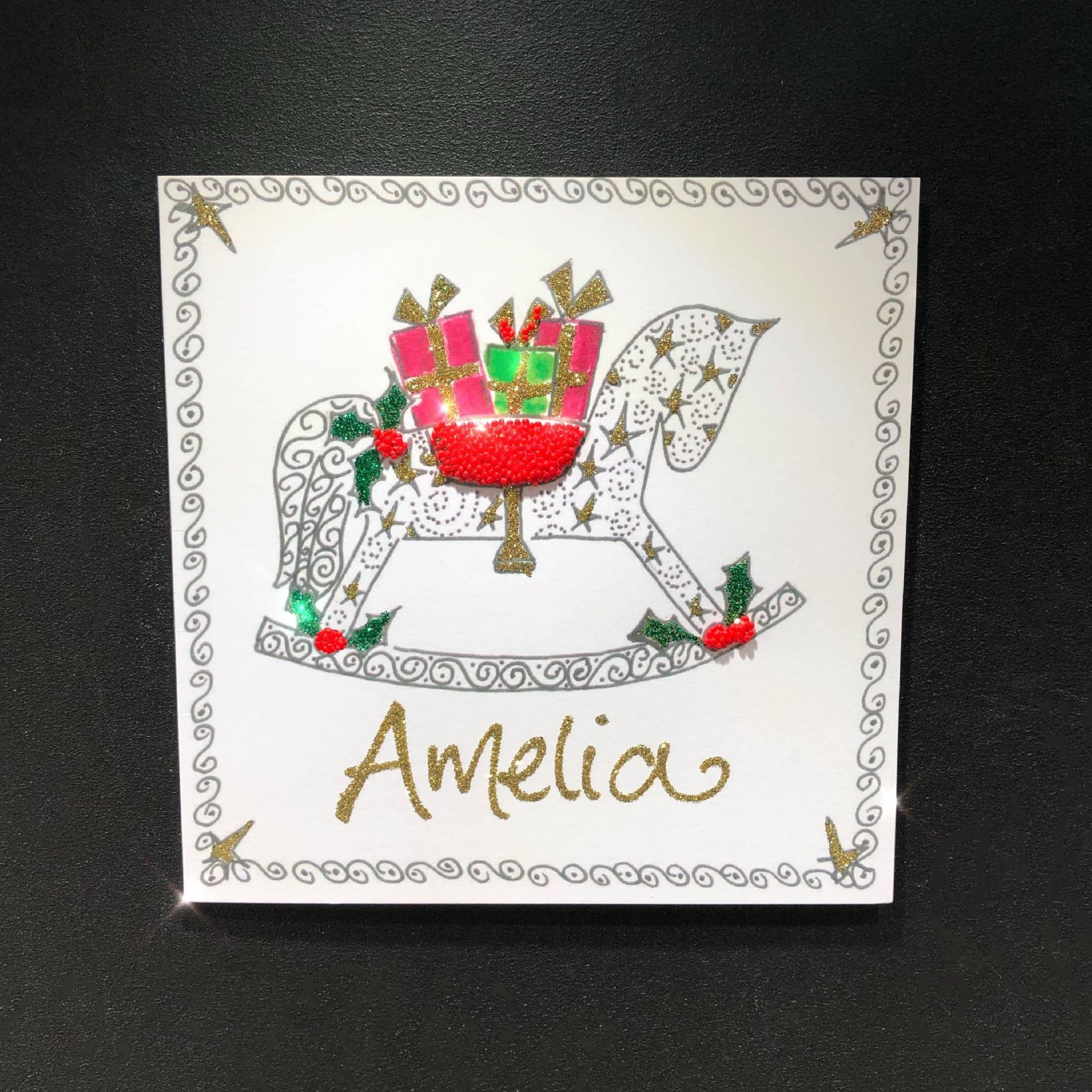 This card is designed for a name to be placed beneath the rocking horse as shown.