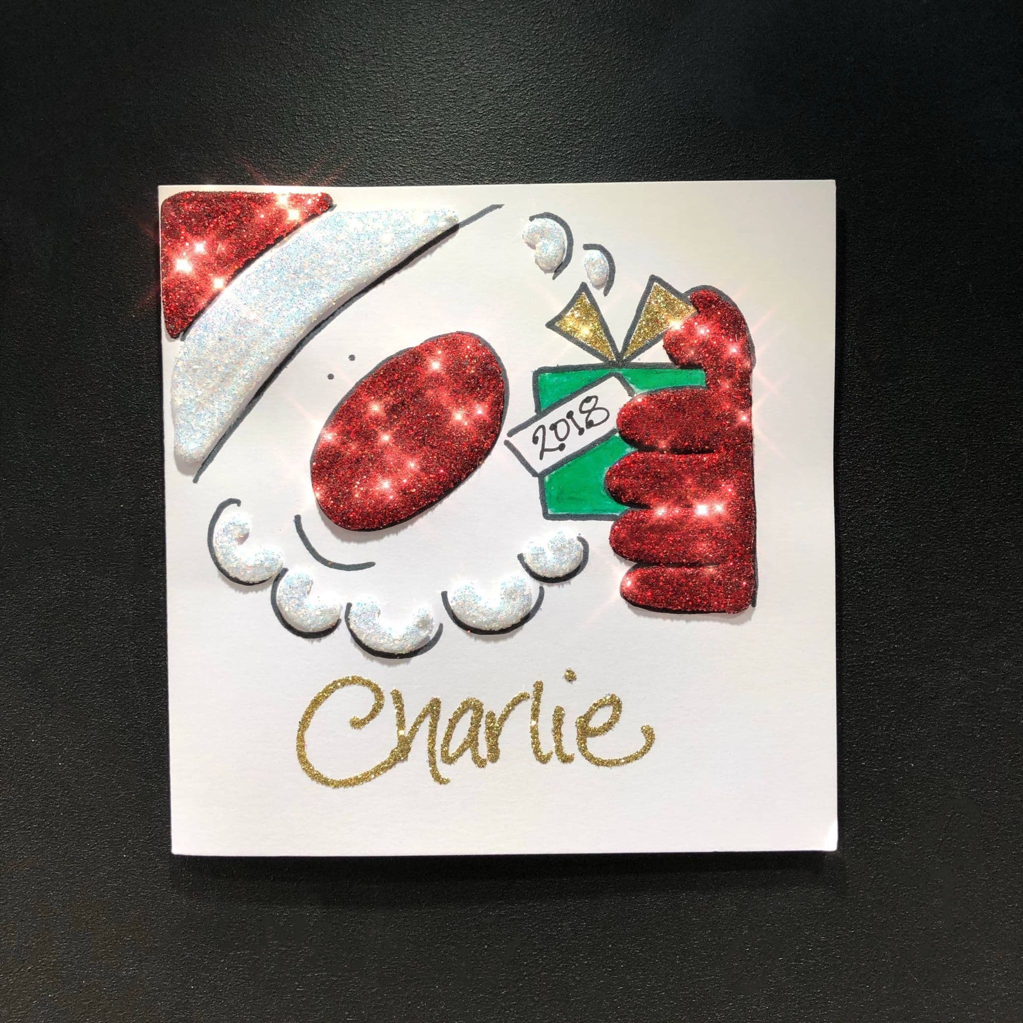This card is designed for and name to be placed below Santa's beard and the year in the tag as shown.